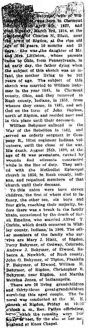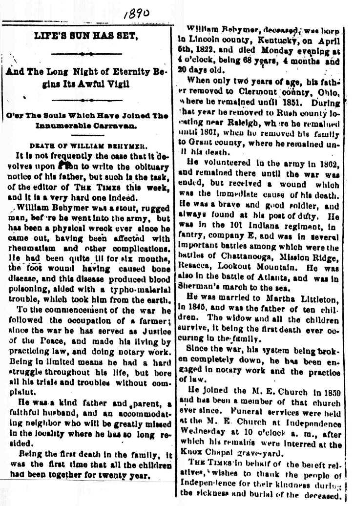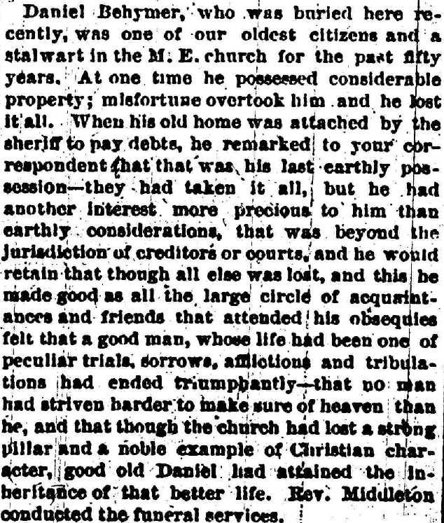 Daniel Behymer (son of Jacob) obit1 from Clermont Sun, 23 Jun 1885