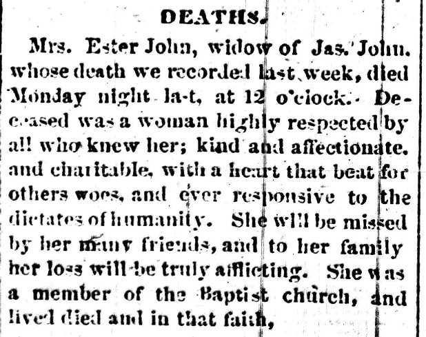 Esther (Behymer) John from Rockport Journal, 29 Nov 1877