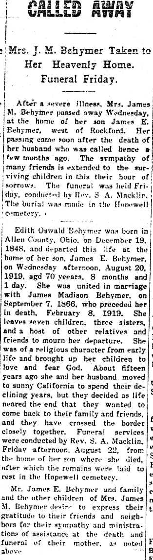 Luella (Brown) Behymer (wife of above) 2 obits - 2nd from Rockford Press, 16 Jun 1916