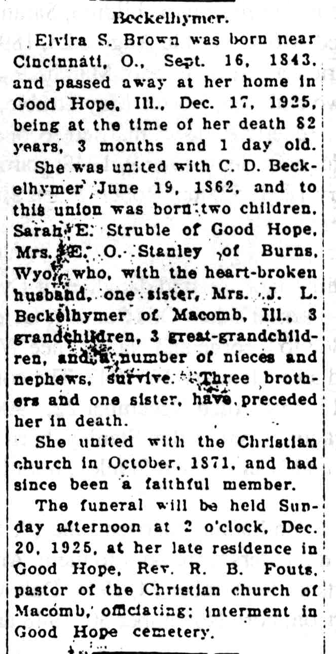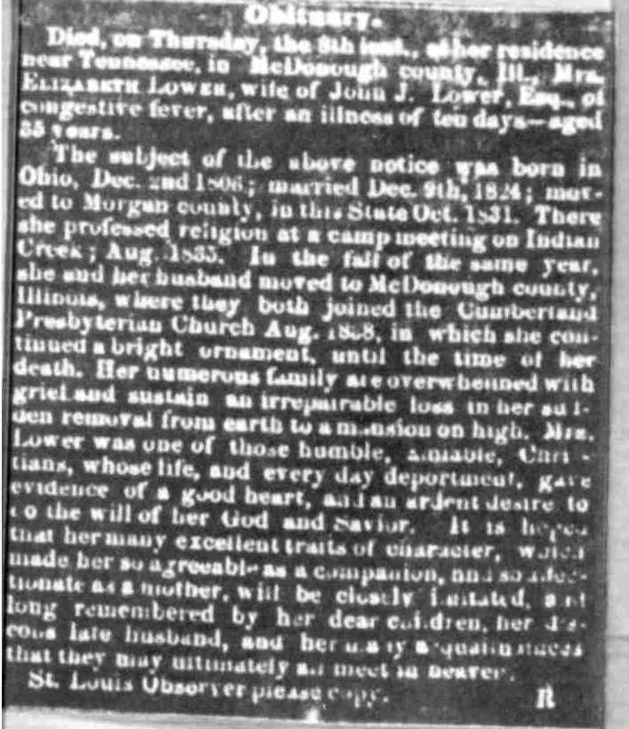 Elizabeth Behymer (daughter of Joseph) obit from Macomb Eagle, 17 Sep 1859