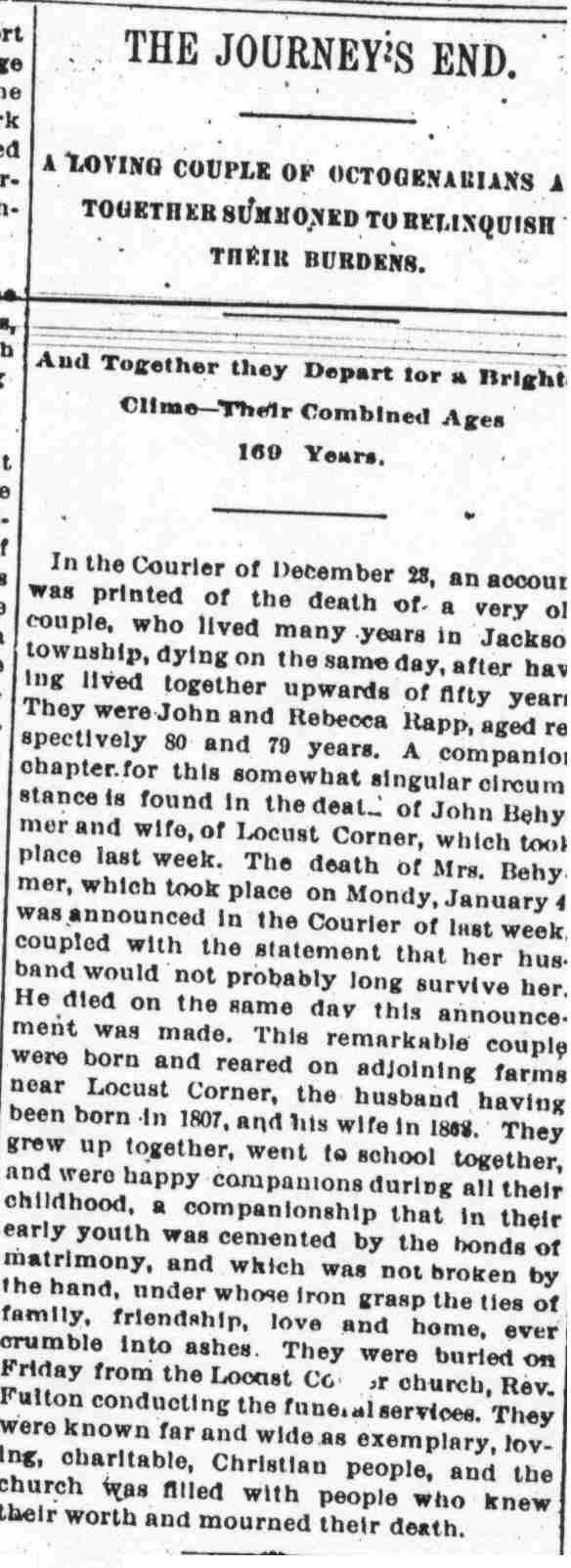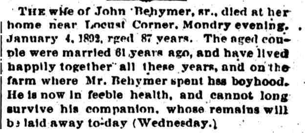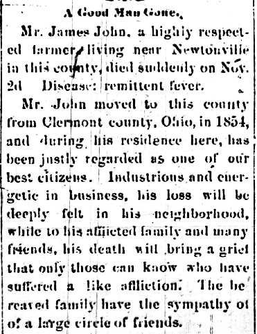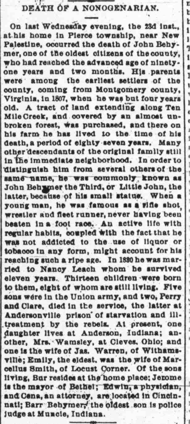 John Behymer (son of Jacob) obit from Clermont Courier, 13 Jan 1892