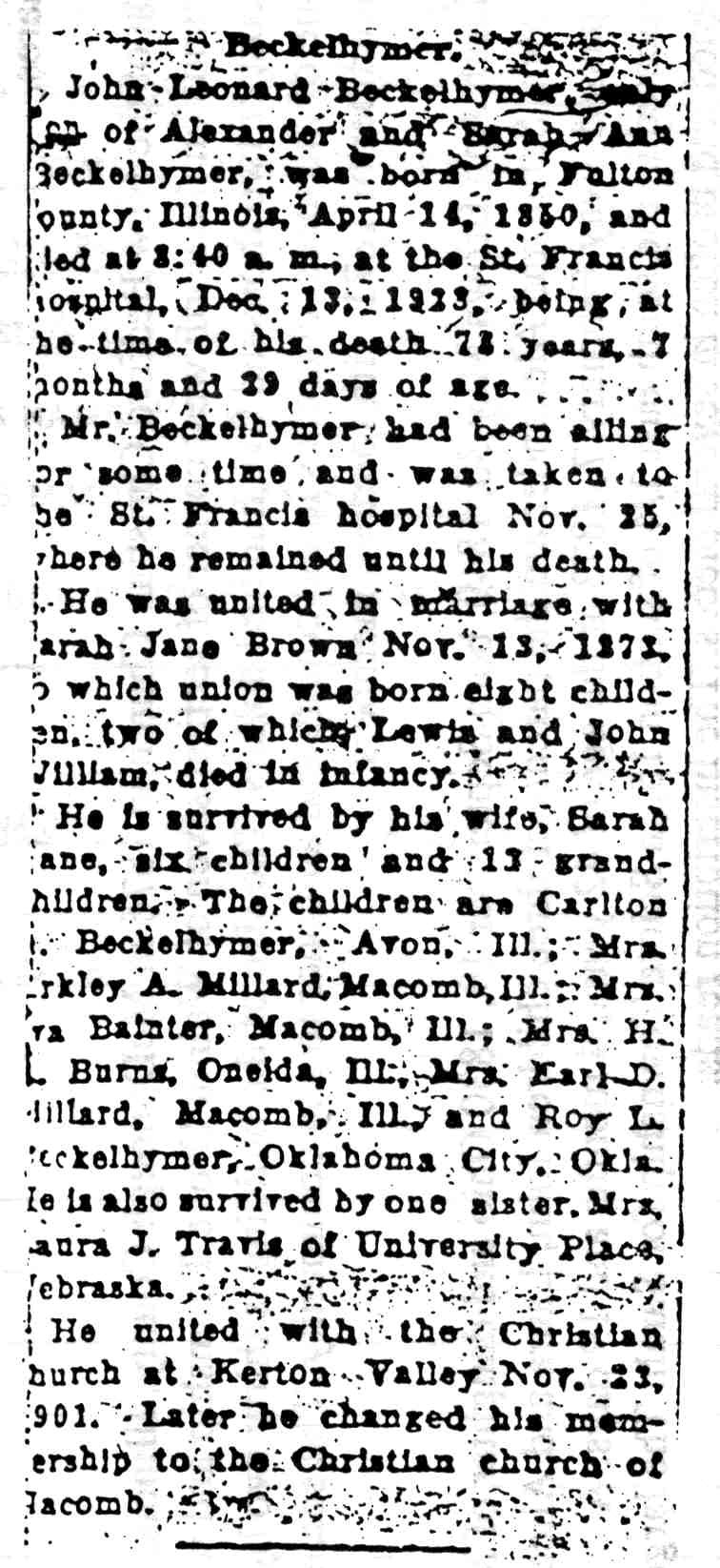 Cyrus Denison Beckelhymer (son of Henry) obit2