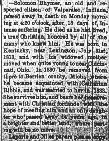 Solomon Bhymer (son of Enoch) obit from Porter County Vidette, 30 Oct 1884