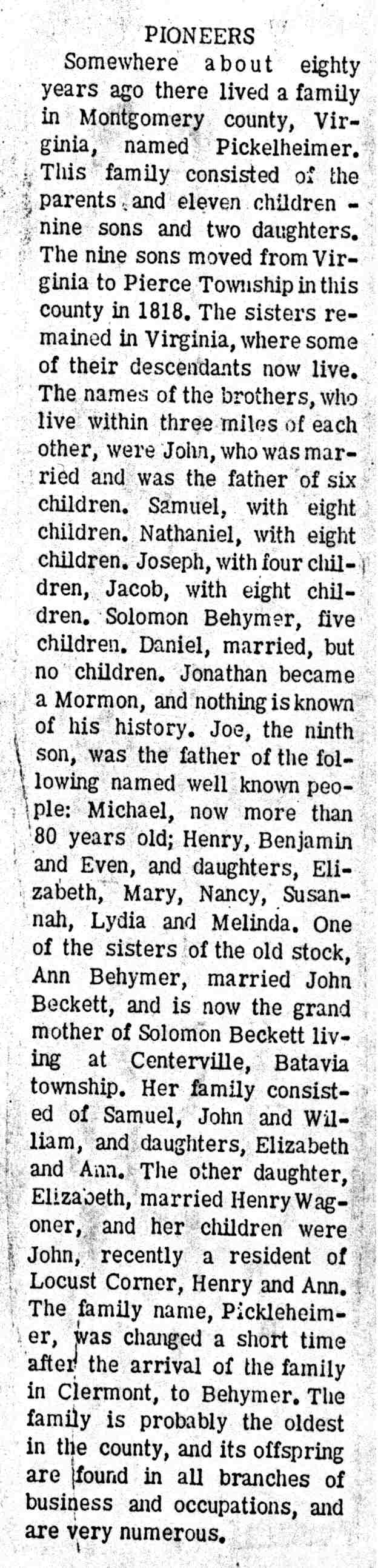 Behymer Family Article from Clermont Courier, 1 Feb 1893