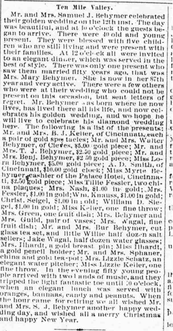 Mr & Mrs Samuel J Behymers' golden wedding anniversary from Clermont Courier, 25 Dec 1889